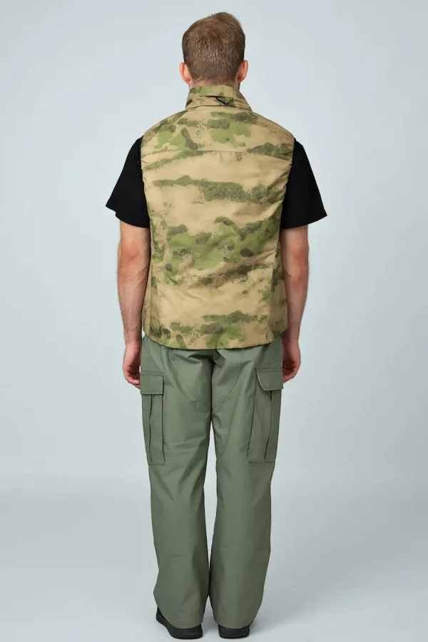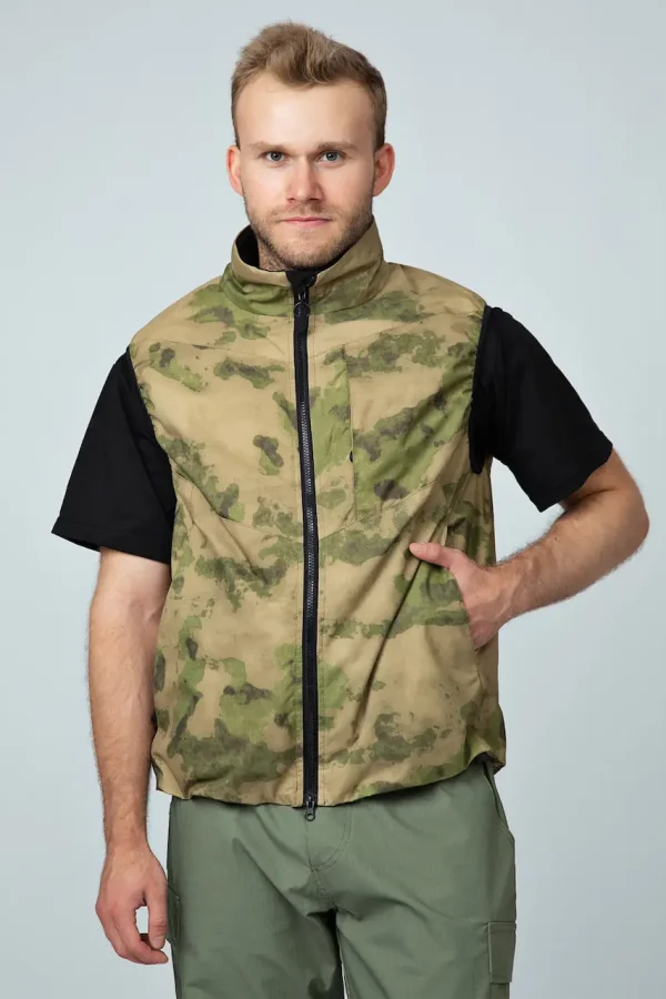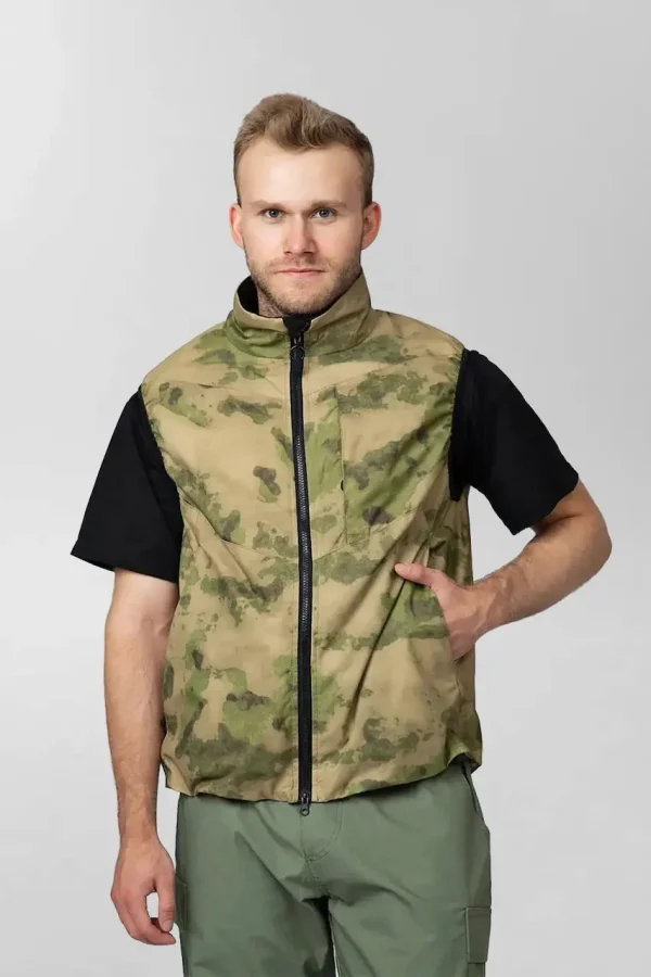 Жилет прямого силуэта, центральная застежка молния, три внутренних кармана по переду с застежкой на молнию. Внутри на правой стороне карман для документов закрывается молнией. Воротник с внутренней стороны из трикотажа флис. Низ жилета по бокам регулируется эластичным шнуром. Молния по переду закрыта ветрозащитным клапаном. Прояма обработана эластичной тесьмой для плотного прилегания.