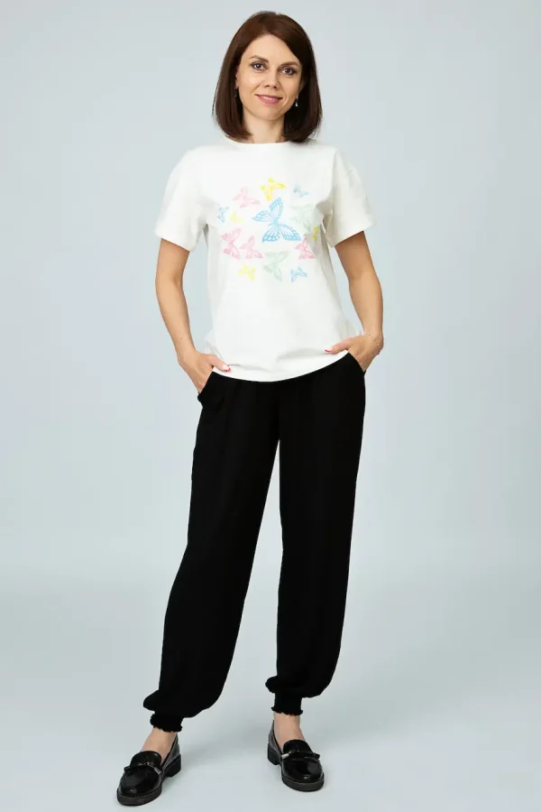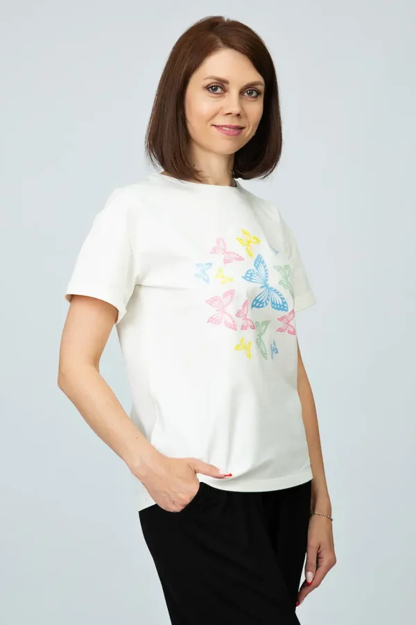 Футболка: классическая, прямой силуэт, короткий рукав, круглая горловина. На футболке принт «бабочки».