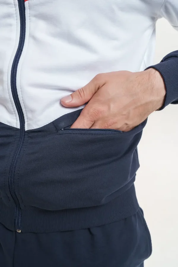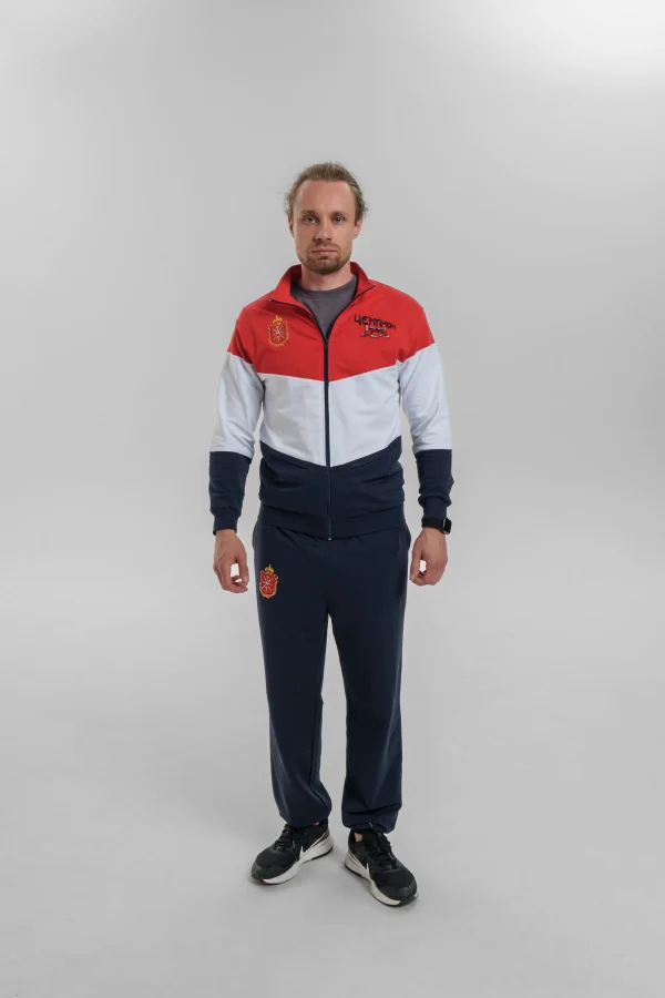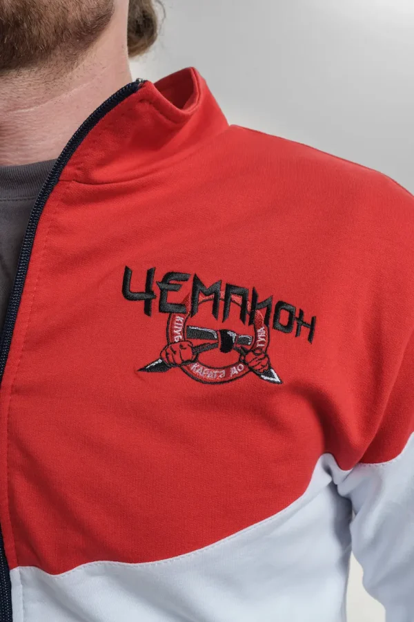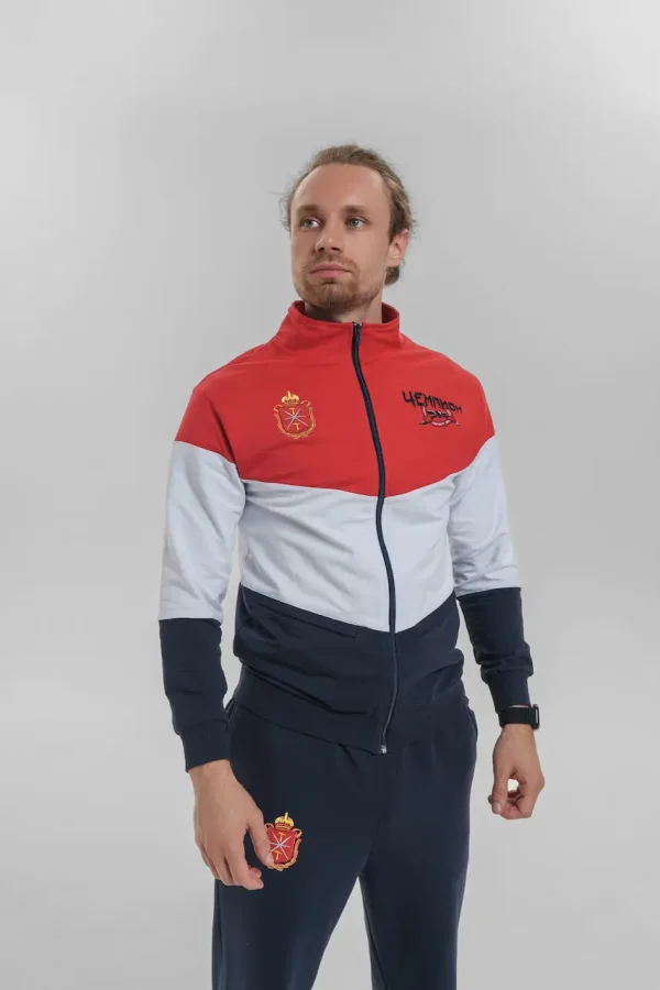 Олимпийка: свободный силуэт, центральная застежка на молнию. Три цветные вставки. Спереди внутренние 2 кармана на молнии. Вышивка логотипа.