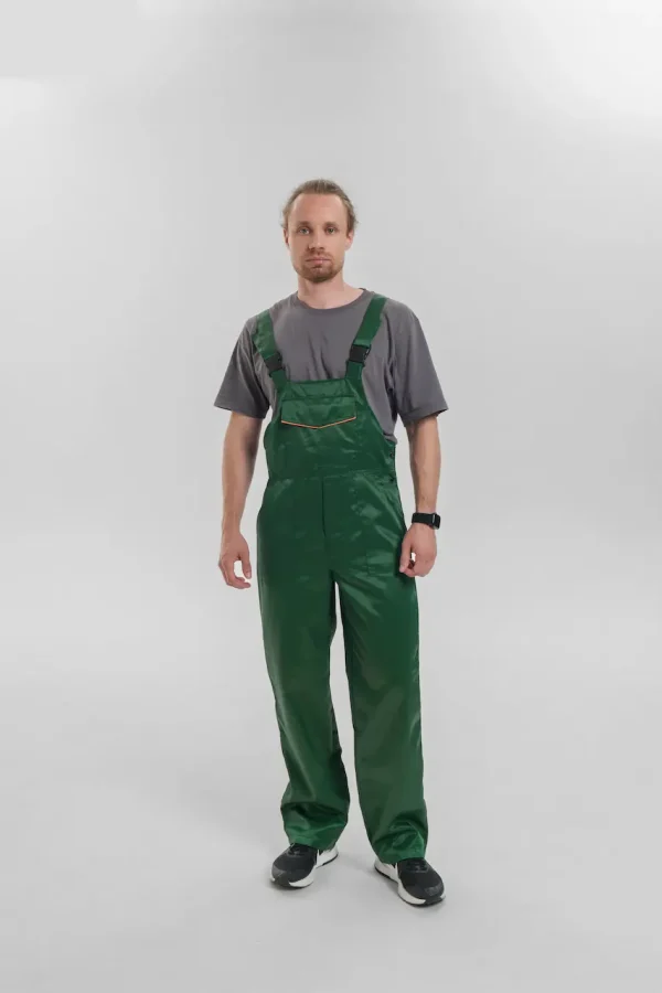 Полукомбинезон: прямой силуэт, нагрудный многофункциональный карман с несколькими отделениями, боковые объемны карманы.